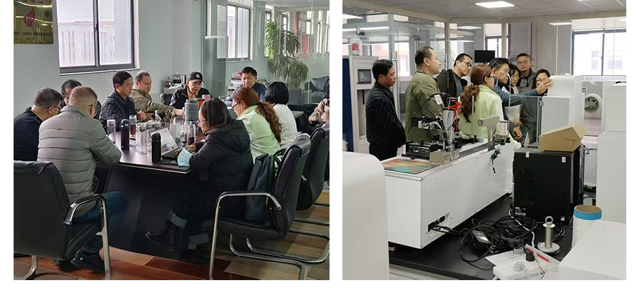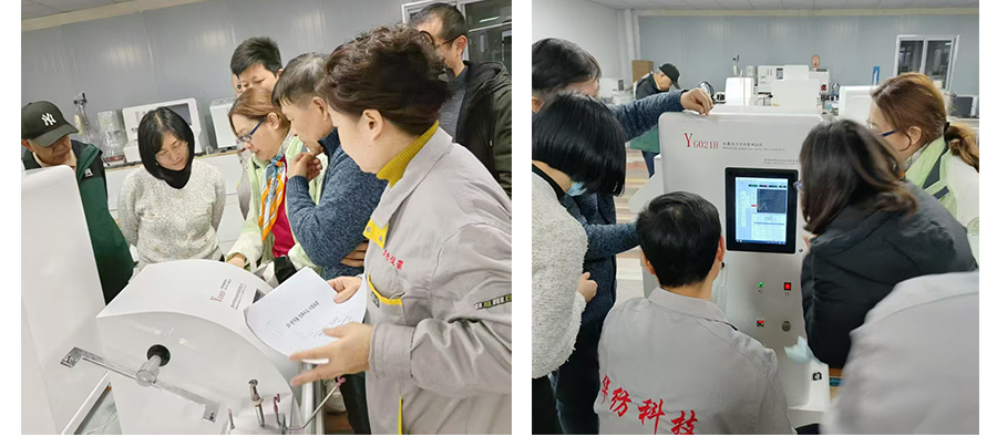 專(zhuān)家教授們制定國(guó)家標(biāo)準(zhǔn),前來(lái)常州華紡儀器,在儀器上邊做試驗(yàn)邊討論。